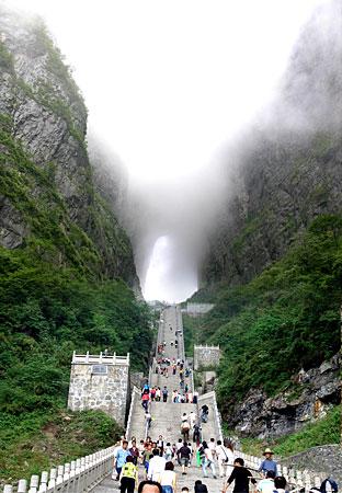 這里的山路99道彎 在懸空了二十四分鐘經(jīng)歷了奇險的8座山峰后,我們的心終于才踏踏實實的落到了地面上,到達了山頂。 山下晴朗山上雨。 乘坐在環(huán)保汽車上,透過車窗所能見到的似黛似玉的畫屏與絕壁千仞的壯觀;所能感受到的是蕩氣回腸的奇絕與如詩如畫的震撼。窗外仍然細雨蒙蒙,環(huán)保汽車繼續(xù)回旋在通天大道的彎道上,突然前面看不到公路的延伸,但車還在原速行駛,讓人多少有點害怕,誰知,在一個180度急轉(zhuǎn)彎后,環(huán)保車依然行駛在懸于半空的通天大道上,安然無恙。這大致就是通天大道的“絕”了,明明無路可走,誰知卻從一個讓你無法想象的角度把你的視線續(xù)接起來;赝幌,真是蠻有意境,象一條巨龍,攀附在山體,蜿蜒而上。 在我還在驚奇“通天大道”蜿延峻巡于群山絕壁之上的絕險感嘆 “通天大道”艱苦建筑于壁立萬傾之中的奇?zhèn)r,思路便被同伴雀躍的歡呼拉回。“看到天門洞了!”。 999級的上天梯,有清代俞良模的提詞:莫謂山高空仰止此中真有上天梯?磥硐胍上蛇真得經(jīng)歷一翻磨難的。做了幾個深呼吸,開始爬上天梯,天門洞已經(jīng)呈現(xiàn):南北對開,大約150米左右高、氣勢磅礴,巍峨高絕,有團團云霧自洞中吐納翻涌,瑰麗神奇,宛如幻境。大約2平方公里的山頂,視野廣闊,往下看去,山在云中動,云附山體游,飄飄然的,還真有點仙人的感覺。洞口的風很大,這雨形成一大塊的雨屏,跟隨洞口來風改變著方向,肆意刮著,落在臉上很舒服…… 天門山是一幅濃墨淡彩的山水水墨畫,需要你慢慢品味…… |