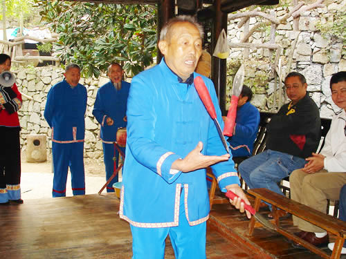 三棒鼓,是以拋三根棒和敲鑼打鼓得名,是土家山寨到處可見的一項(xiàng)以打擊樂器、口頭文學(xué)、表演技藝合為一體的文體活動(dòng)形式。 打三棒鼓通常由三至五人組成,師傅擊鼓唱詞,一人打鑼,一人耍花棒、花刀。由一人表演,將鼓架擺在前面鼓架上,將鑼掛在鼓架下面,用細(xì)繩系著鑼棒套在腳板上,表演時(shí),口唱詞、手打鼓、腳踩鑼,鑼鼓節(jié)拍是按拋花棒、花刀速度的需要而定。三棒鼓的唱詞是五言四句重復(fù)半句組成。即五字一句,四句為一節(jié)。每小節(jié)的第四句要重復(fù)半句。每一小節(jié)擊響鑼鼓四遍。前三句是每唱完擊三響,最后一句唱完即每小節(jié)結(jié)束時(shí)擊響十下。例如唱:"學(xué)打三棒鼓",打"鏘鏘鏘";唱"學(xué)又學(xué)得苦",打"鏘鏘鏘";唱"三歲學(xué)到一十五",打"鏘鏘鏘";唱"學(xué)起呀,學(xué)起走江湖",打"鏘鏘鏘、鏘、鏘、鏘鏘鏘鏘鏘-鏘"。這一小節(jié),每唱一字為一拍,"鏘"為鑼鼓同鳴聲,每聲占一拍,標(biāo)點(diǎn)符號(hào)也占一拍。每拍的快慢取決于花棒下落的速度,任何一個(gè)花棒下落一次均為一拍。因此,如果花棒拋得低,下落的頻率就快,每拍所占時(shí)間就短,反之,花棒拋得高,每拍占的時(shí)間就長。三棒鼓的第二句和第四句都要求壓韻,一句和三句可壓可不壓. 打三棒鼓的技巧性很強(qiáng),思想要高度集中,拋刀拋棒用力要適度,動(dòng)作要敏捷準(zhǔn)確,稍有疏忽大意,不但表演失敗,還會(huì)被刀劃破手腳或誤傷他人。因此,凡是學(xué)打三棒鼓者,均需經(jīng)常練習(xí)飛拋接技術(shù),做到閉目均能拋接刀棒。因此,土家族青少年經(jīng)常用三個(gè)卵石練習(xí)拋接技術(shù),久而久之,熟能生巧,不但會(huì)拋棒,而且能拋刀。 打三棒鼓的鑼鼓曲牌不變,但唱詞多種多樣,除了固定的《十二月花》等唱詞外,均為即興編詞隨口而唱,唱三棒鼓歌的人,都是腦筋靈活、口才伶俐者。 |