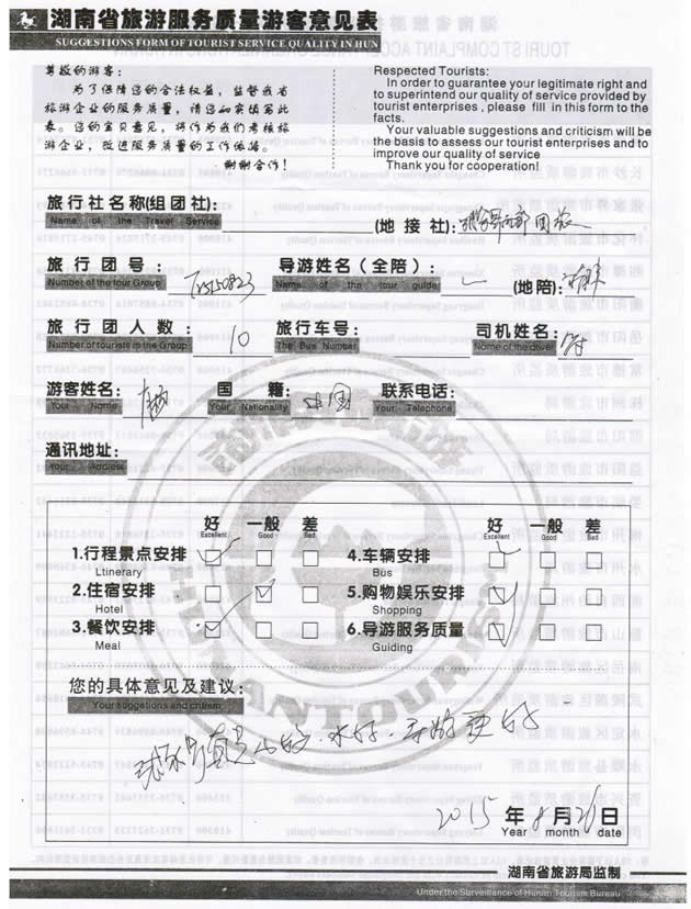 現(xiàn)在位置:首頁 -> 西部國旅->旅游質量反饋 -> 2015-8-23 江蘇肖女士一行10位貴賓 天門山、張家界、天子山、黃龍洞三日游