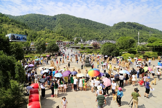 7月29日上午9點(diǎn)30分,由張家界市人民政府主辦,張家界市委宣傳部、市旅游和外事僑務(wù)委員會(huì)、市文體廣電新聞出版局、武陵源區(qū)人民政府承辦,黃龍洞景區(qū)協(xié)辦的“絕版張家界,最炫民族風(fēng)”張家界民俗活動(dòng)月第三場(chǎng)活動(dòng)在黃龍洞景區(qū)啟動(dòng)。現(xiàn)場(chǎng)以土家人慶祝豐收的鼓舞拉開序幕,土家鼓舞歡悅的節(jié)奏,夸張的舞姿開場(chǎng)就吸引了幾千游人和當(dāng)?shù)厝擞^看。草根夫妻檔歌手,張家界“山水組合許勇、舒維亮麗的服飾,野性的嗓音……”以一首《我在高山唱》歌曲,征服現(xiàn)場(chǎng)游客,贏得雷鳴般的叫好聲。