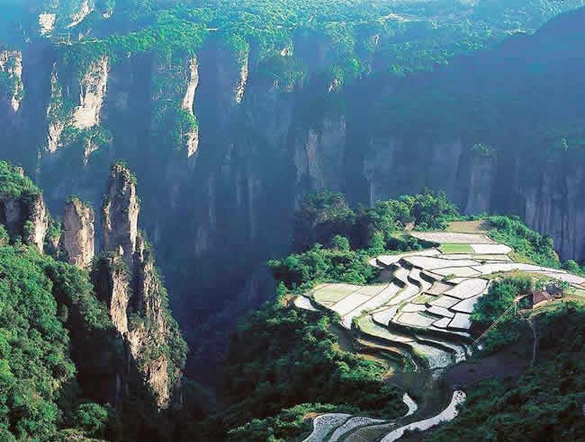 空中田園坐落在天子山莊右側(cè)經(jīng)老虎口、情人路方向兩公里處的土家寨旁,海拔1000余米。它的下面是萬丈深淵的幽空中田園谷,幽谷上有高達數(shù)百米的懸崖峭壁,峭壁上端是一塊有3公頃大的斜坡梯形良田。田園三方峰巒疊翠,林木參天,白云繚繞,活像一幅氣勢磅礴的山水畫。登上“空中田園”。清風(fēng)拂袖,云霧裹身,如臨仙境,使人有青峰鳴翠鳥,高山響流泉,身在田園里,如上彩云間”之感 。