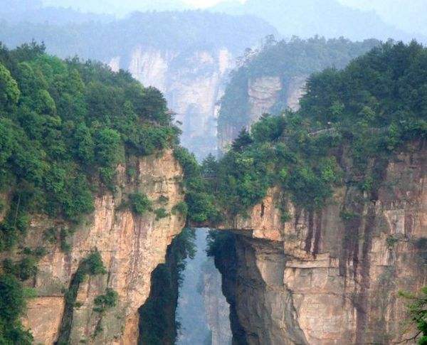 “后花園”至天下第一橋,有一條全長2000多米的游道,路面多為白色的條石鋪成,站在遠處觀望,很像一條白色的綢帶打了兩個結(jié),一頭系在“迷魂臺”,一頭第在“天下第一橋”。信步漫游,沿途可欣賞到“拜仙臺”、“百丈絕壁”、“小洞天”、“情人谷”等別有情趣的景點,這里海拔不高,一般不受氣候影響,慢慢品味,定會使您賞心悅目!疤煜碌谝粯颉笔菑埣医纭笆蠼^景”之一。也是袁家界的標(biāo)志性景點,它是居于兩山之間形成的一座天然石橋,而兩山原為一體,橋身是兩山相連的關(guān)鍵部分,但因中間石質(zhì)較為薄弱,由于風(fēng)化、崩塌作用的影響,又經(jīng)過日曬雨淋、流水洗刷、山洪沖擊,久而久之,終于形成今天這一特別的奇景……。自杉刀溝上袁家界,沿絕壁頂部邊緣遨游,至于中坪“觀橋臺” 遙望千米之外,只見一天然石橋凌空飛架兩峰之巔,氣勢磅礴,奇?zhèn)ソ^倫,被稱為“天下第一橋”。石橋?qū)拑H3米,厚5米,跨度約50米,相對高度近400米。天下第一橋與夫妻巖并稱“張家界雙絕”!疤煜碌谝粯颉睒蛎鎸拑擅,厚四米,跨度為二十多米,高度為三百多米,是世界是迄今為止所發(fā)現(xiàn)落差最高的天然石橋。