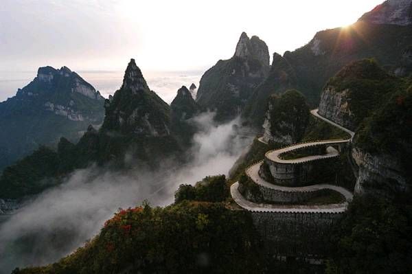 天門山盤山公路共有99道急彎,其中最為險峻的一段是經(jīng)過科學(xué)的論證及設(shè)計才得以修建成功的,大家可以通過圖片看到其中公路之險峻。