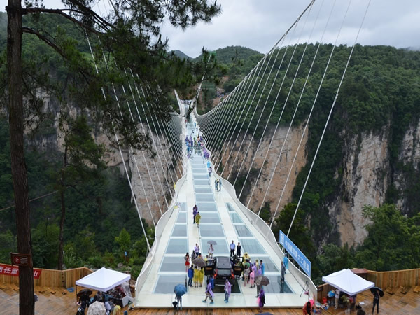 上 午:早餐后07:30至08:00 準(zhǔn)時(shí)統(tǒng)一集合乘車赴“小九寨溝”之美譽(yù)的張家界大峽谷景區(qū)。(車程約60分鐘)【張家界大峽谷+玻璃橋B線】(門票已含),(已含首道門票,含游船費(fèi),游覽時(shí)間約3個(gè)小時(shí)),零距離接觸張家界“奇峰三千,秀水八百”的神奇瑰麗。觀天仙水瀑布、蝴蝶泉瀑布、竹仙泉、翠潭攬瀑;行于一線天、天梯棧道、石壁裂縫、石上森林;探怪謎洞、佛手遮天、爛船巖千古流傳的未解之謎;谷中猴群歡躍,百鳥爭(zhēng)鳴,湖水清澈、群山倒蘸 ,鴛鴦戲水、空氣清新、絕無(wú)僅有。形態(tài)各異的瀑布群,把生命之源傾瀉得淋漓盡致;隨海拔變化的植物帶,將四季更替演繹得如詩(shī)如歌;數(shù)條彩虹,百米梭板,千年風(fēng)情,萬(wàn)米長(zhǎng)廊,把峽谷內(nèi)裝扮得如畫似錦。體驗(yàn)世界最高最長(zhǎng)首座斜拉式高山峽谷玻璃橋【云天渡】,漫步天上人間、輕吻藍(lán)天白云、帶上你的心靈從這頭走到那頭、走過(guò)青絲到白發(fā)!挑戰(zhàn)極限,戰(zhàn)勝自我(上橋游覽時(shí)間為20-30分鐘);(玻璃橋游覽注意事項(xiàng):1、遇大風(fēng)、暴雨等極端惡劣天氣,玻璃橋有可能關(guān)閉,關(guān)閉不能通行時(shí)不退任何費(fèi)用;2、除錢包和帶有手機(jī)套的手機(jī)外,任何物品不得帶上橋;3、凡有心臟病、高血壓、恐高癥及醉酒和其他身體不適宜游覽的,請(qǐng)勿上橋;4、穿高跟鞋的游客不允許上橋;5、不得在橋上追逐、打鬧,拋物,不得倚靠橋上欄桿,以防身體傾斜,發(fā)生意外。6、游客在游覽過(guò)程中請(qǐng)聽從景區(qū)工作人員管理)!