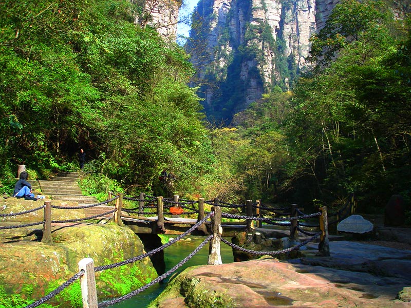 上 午:導(dǎo)游與司機在機場或車站、酒店舉牌接游客,然后乘車40分鐘前往【張家界國家森林公園】(門票已含),徒步游覽“世界上最美麗的峽谷”---【金鞭溪景區(qū)】,(包含觀音送子、豬八戒背媳婦、神鷹護鞭、劈山救母、西游記外景拍攝地、長壽泉、千里相會等景點)。走完金鞭溪后,有兩種游覽方式上至山頂?shù)摹驹医缇皡^(qū)】(其一:可從金鞭溪的千里相會從亂竄坡徒步上袁家界,其二:可從水繞四門乘坐環(huán)保車至百龍電梯下站,然后乘坐世界戶外第一電梯至山頂?shù)脑医纾冽堧娞?2元/人游客自行購買)。
